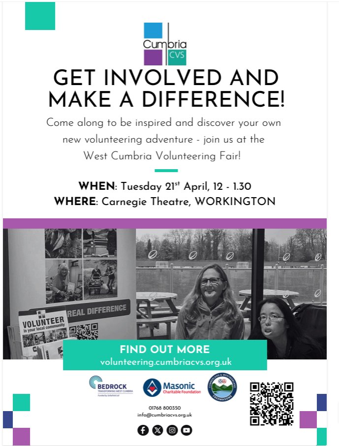 Cumbria CVS are hosting a Volunteering Fair, which will be an opportunity for people from all walks of life to find out more about volunteering, how they can get involved in making a difference in the local community, and how they themselves can benefit from volunteering (for example through gaining skills/experience, improving employability, making social connections, improved wellbeing, and more).