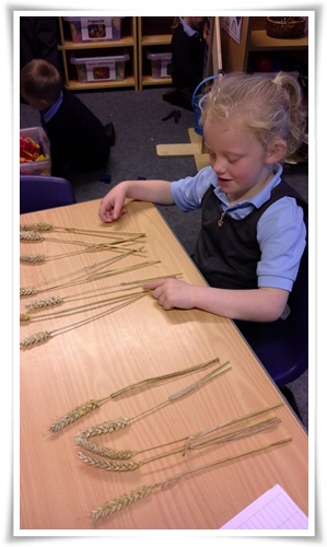 Indoors, with wheat, counting two groups to find the total number by counting all of them.